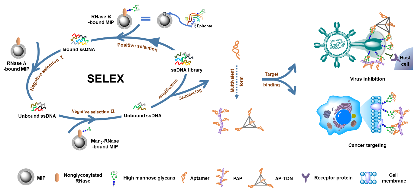 图1. 用于病毒抑制和癌细胞靶的向高甘露糖特异性适配体的筛选、加工及作用原理示意图