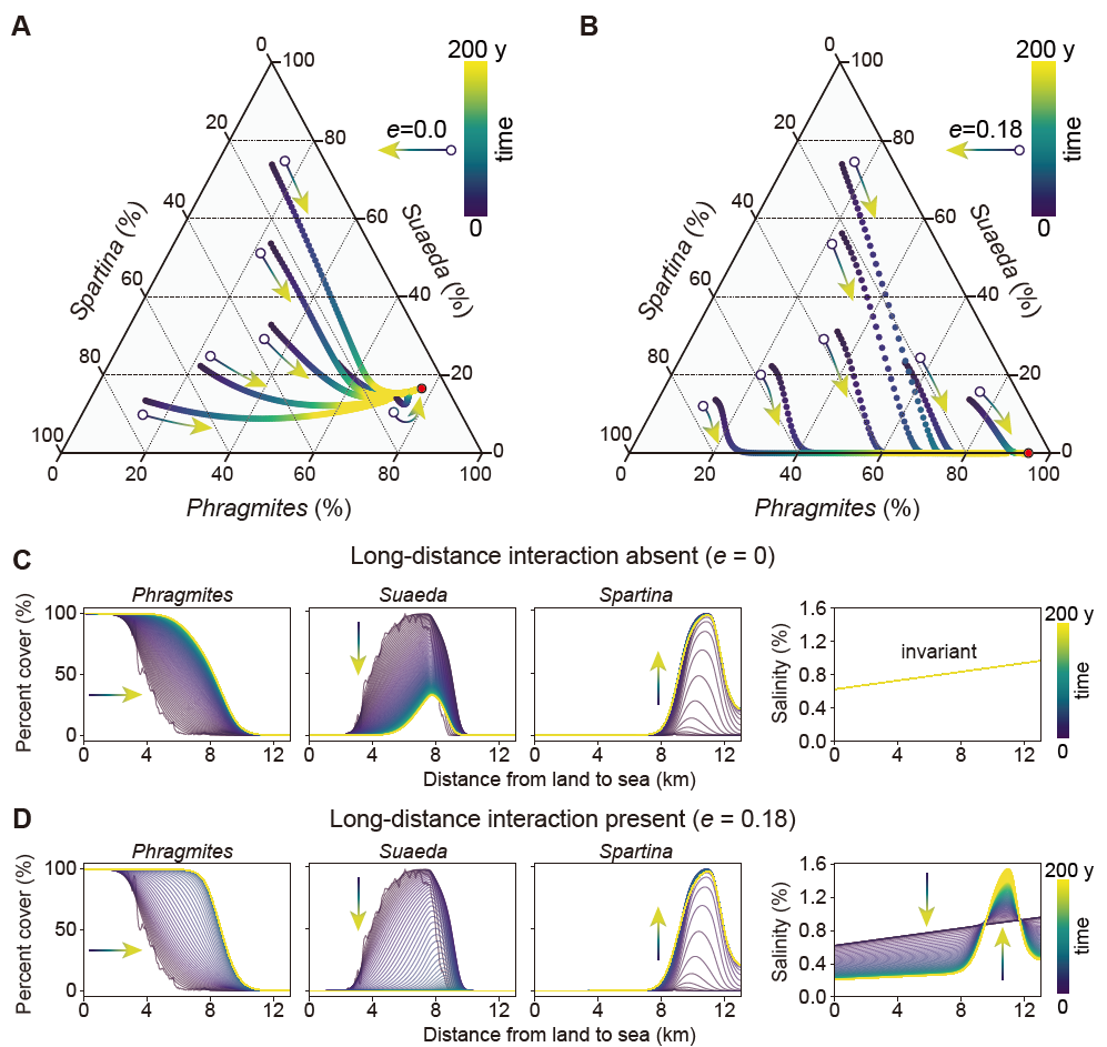 图2. 模型分析揭示长距离相互作用对滨海湿地生态系统的影响。图中参数为长距离相互作用强度系数。图A、C和图B、D分别显示长距离相互作用缺失和存在时生态系统的稳态和瞬态.