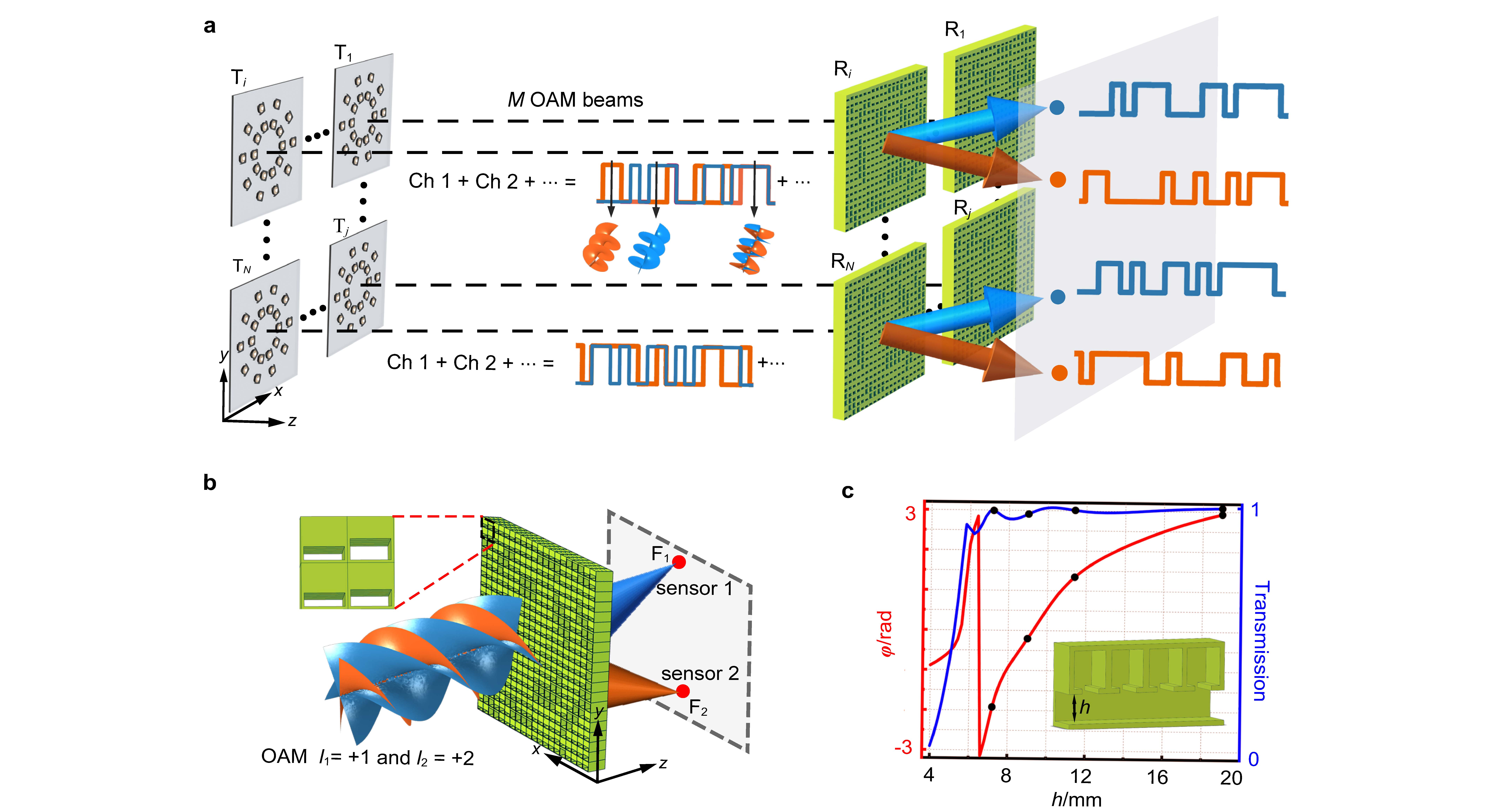 1.a基于超构材料的多路径扭曲声波通信系统原理图。b自由空间中复合角动量信息一体化无源解调机制示意图。c超构单元声学响应。
