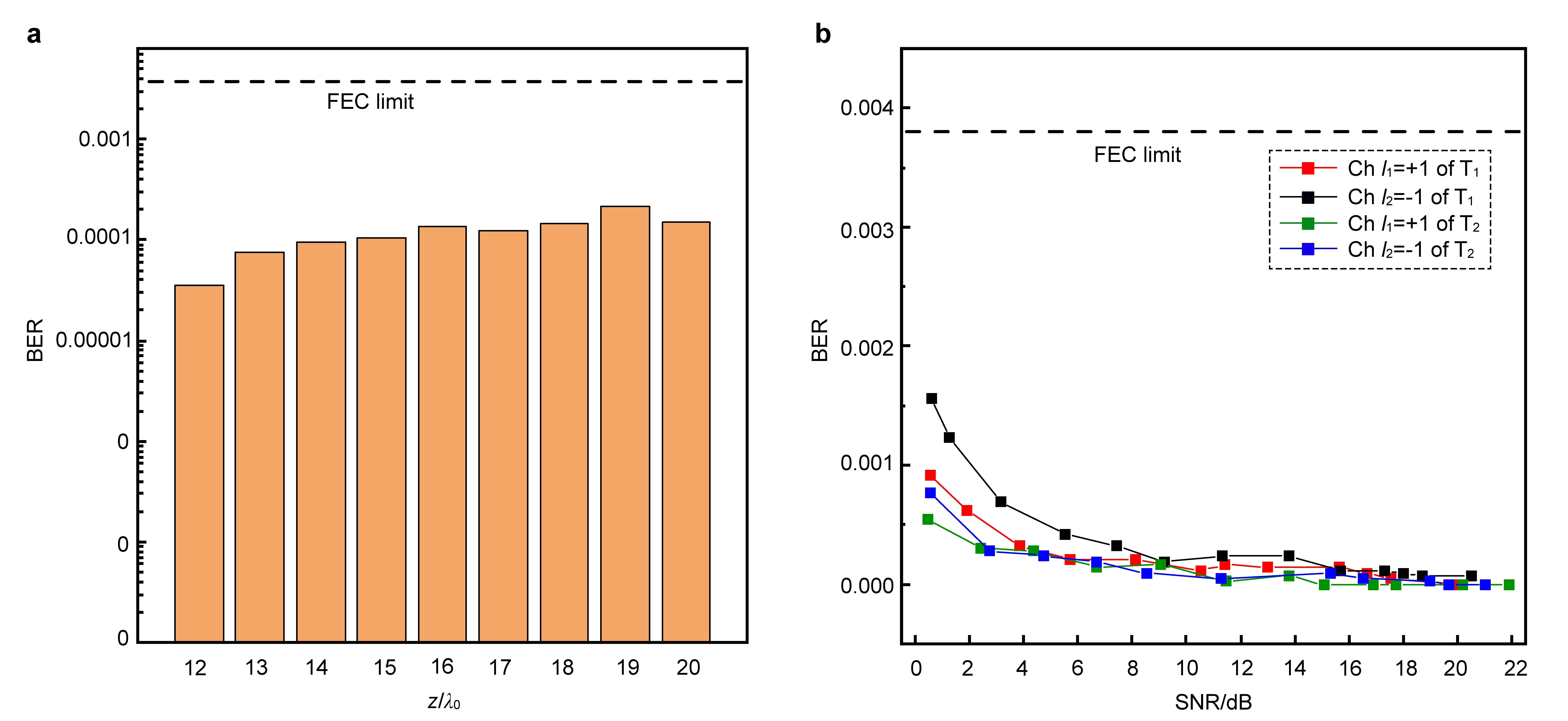 3.a凯发k8官网校徽图像的误码率关于传输距离变化关系的实验测量结果。b四个信道的误码率随信噪比变化关系的实验测量结果。