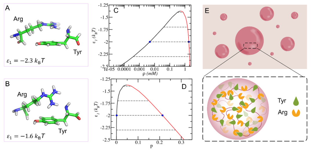 图1. FUS蛋白的相分离机制。(A-B)蛋白质氨基酸间的微观作用模式;(C-D)纯FUS蛋白质体系相图;(E)蛋白质凝聚体内部网络结构示意图。