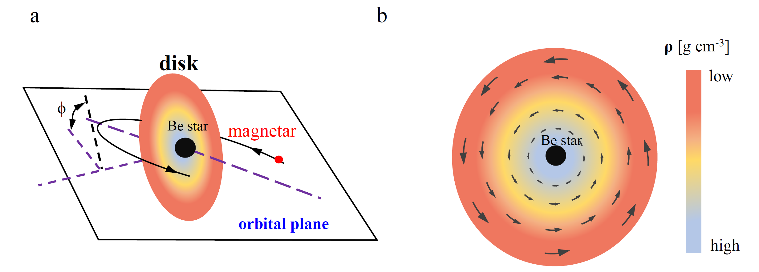 图1. (a)磁星和Be星组成的双星系统。(b)Be星风盘的磁场和密度分布。