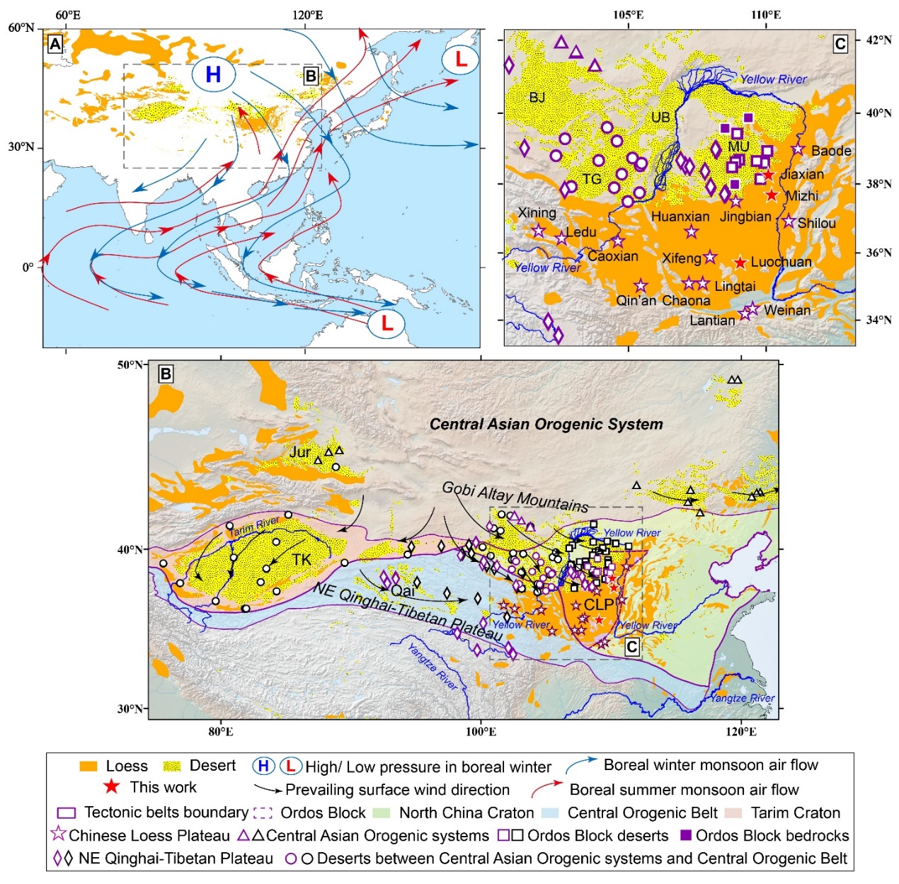 1. 黄土高原的位置及其与潜在的物源区的联系。其中,橙黄色区域是黄土堆积区