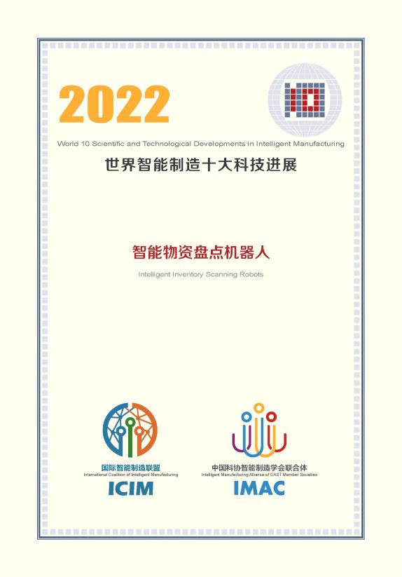 "智能物资盘点机器人"融合智能机器人、物联网、人工智能等多项交叉学科技术,攻克了开放复杂场景下机器人导航、海量密集场景下批量物资识别、移动扫描场景下精准物资定位和动态多任务场景下机器人群智协同等多项关键技术挑战,盘点效率超过20000件/小时,盘点精度高达99%,性能指标国际领先。获第46届日内瓦国际发明展——特别金奖、2020年度中国好技术、第22届中国国际工业博览会——特等奖等荣誉。目前,该盘点机器人已在全国20多个省、直辖市广泛应用,涉及仓储物流、电力物资、服饰鞋履、图书馆、档案馆等诸多领域,为全球大规模物资盘点历史难题贡献"中国智慧"和"中国方案"。