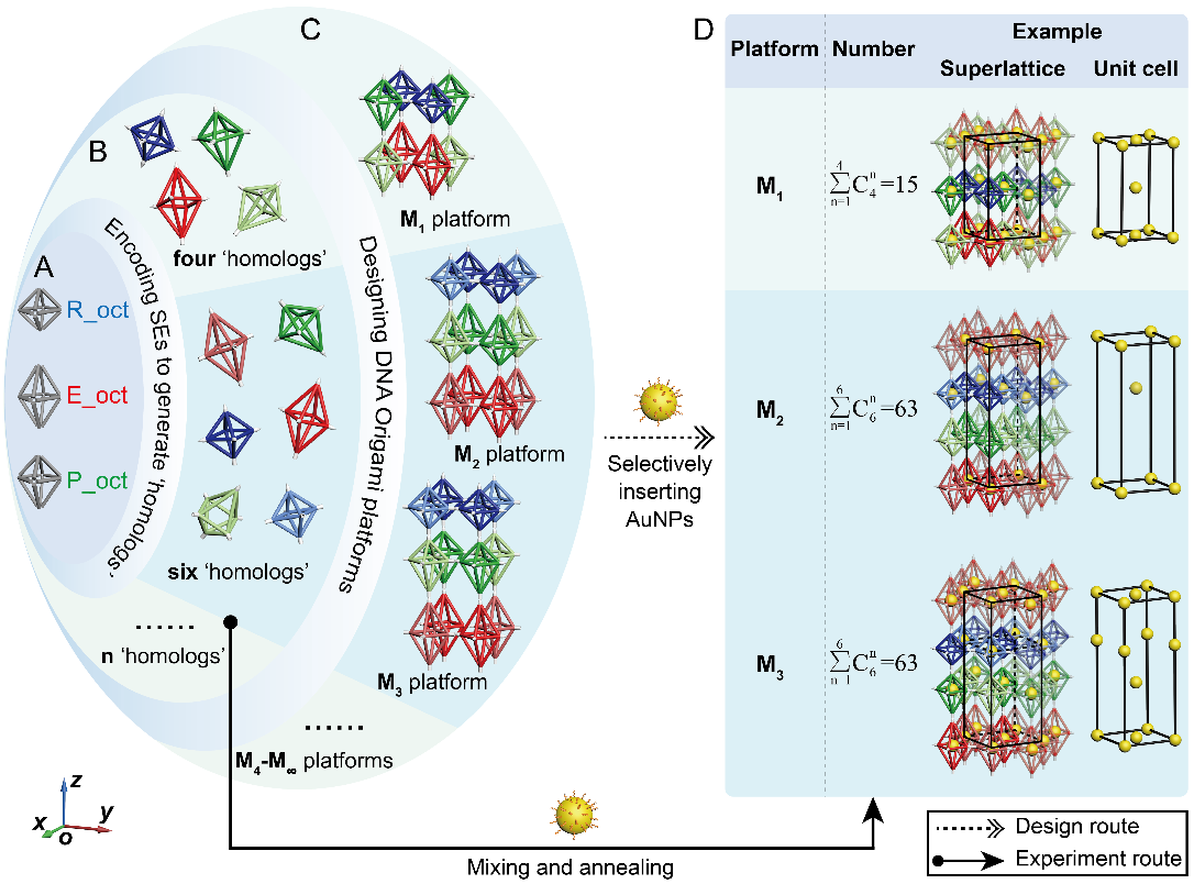 1. 利用三种不同形状的八面体DNA折纸多样化构建纳米粒子超晶格示意图