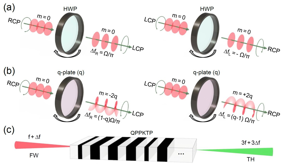 2. 三次谐波产生中旋转多普勒三倍频移(a)旋转半波片和(b)旋转q-用于引入旋转多普勒频移(c)准周期准位相匹配晶体可将基频光的多普勒频移放大至上转换光的三倍。