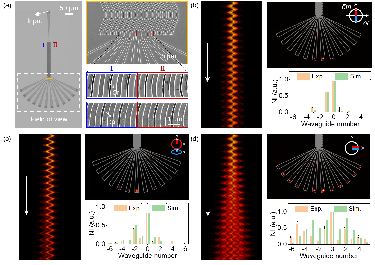 在实验中,研究人员加工了设计好的3组样品,包括"虚质量"翻转情形、外尔环相变情形、并以厄米平庸态样品作为对照。实验通过将1550 nm波长的激光耦合输入到界面附近的波导,并将输出端的信号通过扇形的结构引出(图4(a))。可以看出,在"虚质量"翻转及外尔环相变情形下,可以在输出端的界面处观察到很强的光场分布(图4(b,c)),而厄米的对照样品在输出端表现为发散的光强信号(图4(d))。