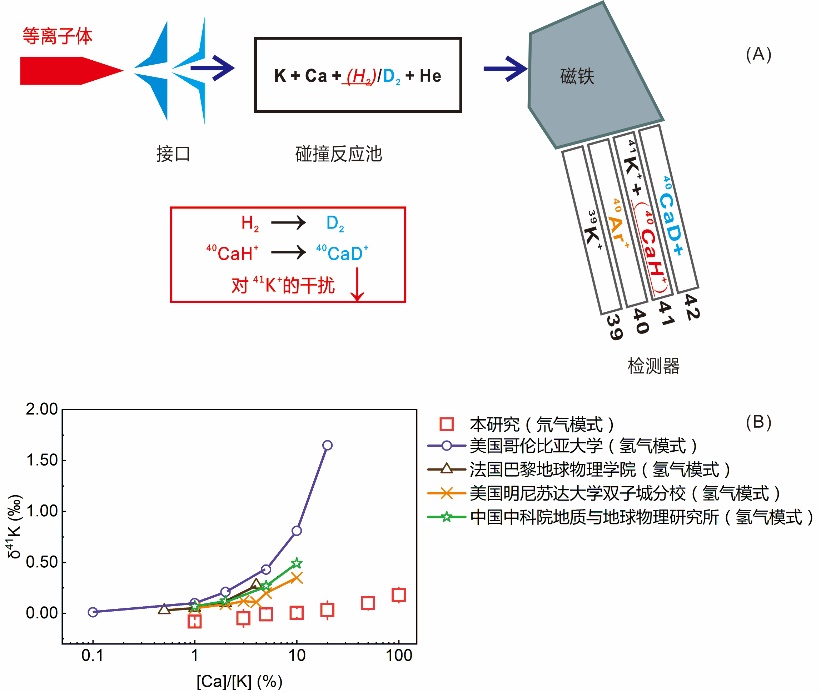 图 1. A 碰撞反应池多接收等离子体质谱仪测量K同位素分析方法的原理;B 本研究与前人研究中Ca基质对K同位素测量的影响对比。