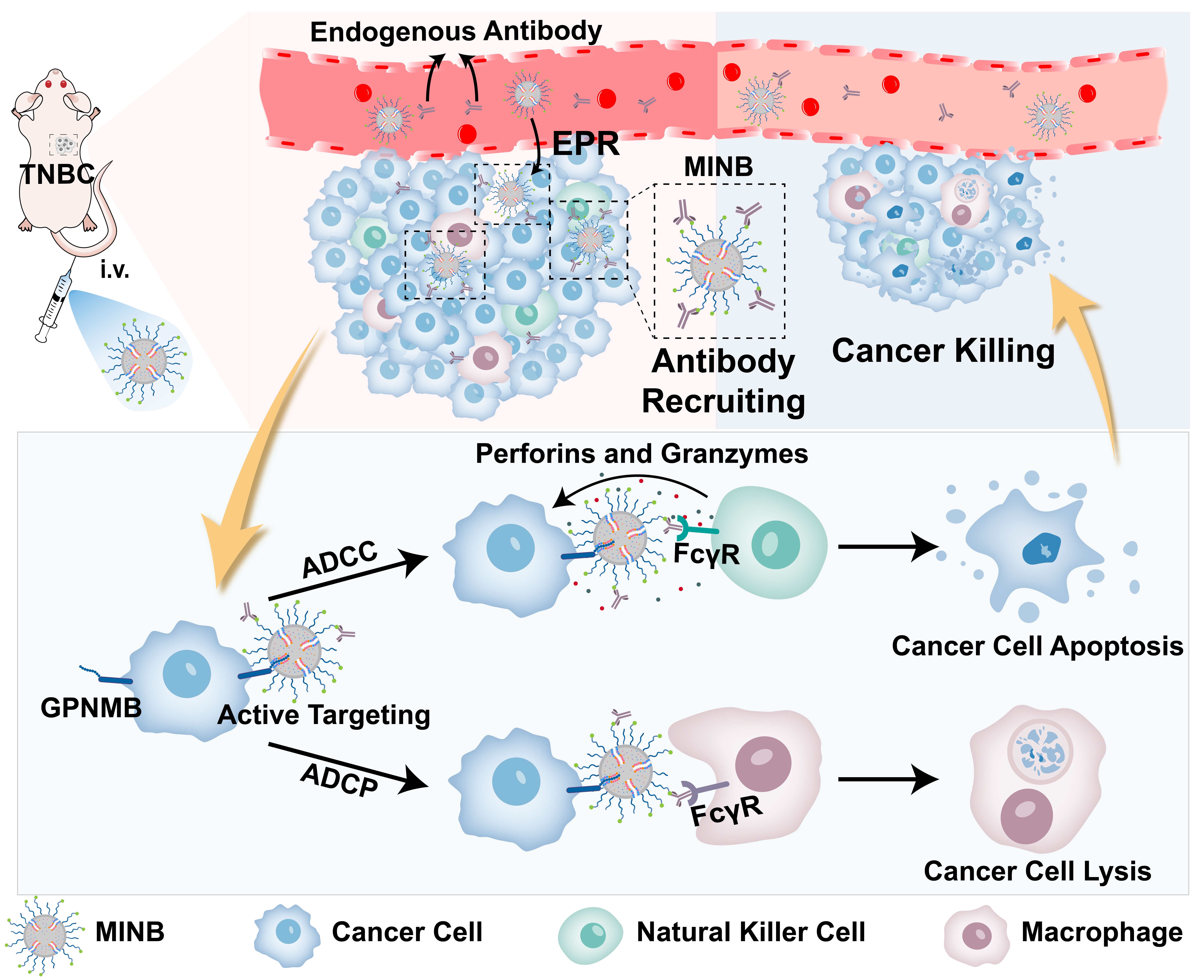 鉴于此,我校刘震教授团队在前期基于反向微乳液的可控表面印迹(ROSIC)技术(Adv. Sci. 2021, 8, 2101713; Sci. Bull. 2022, 67, 278-287) 以及分子印迹癌症治疗应用(Angew. Chem. Int. Ed. 2019,58: 10621; Angew.Chem.int. Ed. 2021,60,2663-2667; ACS Nano, 2021, 15, 11, 18214–18225; Small 2022, n/a, 2201671; Chem. Sci. 2022, 13, 10897-10903 ) 等的基础上进一步开辟了仿生分子识别实现肿瘤免疫治疗的新路径。该策略开发了一种称为分子印迹纳米信标(MINBs)的平台,能靶向识别三阴性乳腺癌,并能重定向固有免疫细胞以特异性地杀死癌细胞。该研究以难治的三阴性乳腺癌(TNBC)为癌症模型,以生物标志物非转移性黑色素瘤糖蛋白B (GPNMB) 的N端表位为模板合成了具有识别能力的分子印迹纳米粒子(nanoMIP)。最后在粒子表面修饰上半抗原荧光素(FITC),半抗原能够被其特异性的抗体所识别结合。这样,所合成的分子印迹纳米信标就可以通过识别靶标GPNMB先靶向标记TNBC细胞,从而为半抗原相关的抗体提供导航与定位。所招募到的抗体可以进一步结合免疫细胞上的受体,招集免疫细胞到肿瘤部位来,触发抗体依赖的细胞毒性作用 (ADCC)使得自然杀伤细胞释放一些毒性物质杀死肿瘤细胞,以及抗体依赖的细胞吞噬作用(ADCP)使得巨噬细胞将肿瘤细胞吞噬消化(原理见图1)。该策略不仅提供了一种全新的新肿瘤免疫治疗方法,不依靠任何药物实现了对TNBC的有效消灭。而且,这种纳米平台可以扩展到其它靶点来发展针对其他疾病的免疫治疗。