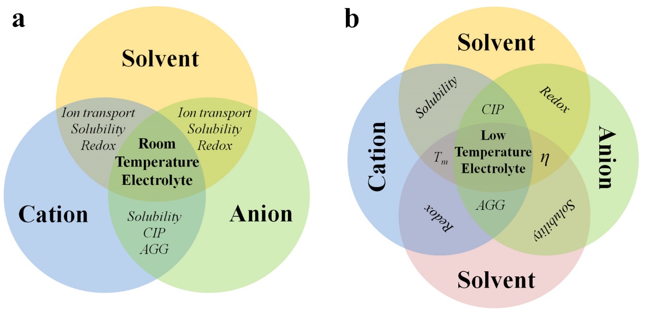图1. 分别在室温和低温电解液中阳离子-溶剂-阴离子之间的的(a)"三角"和(b)"四角"基本相互作用示意图及其相关的构效关系。