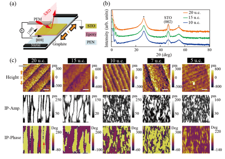 图1| a) 自支撑SrTiO3薄膜的单轴应变调控装置;b) 不同厚度自支撑SrTiO3薄膜的XRD 2θ-ω 曲线;c) 单轴应变固定为1.8%时,压电力显微镜(PFM)表征畴结构随厚度变化的依赖关系。