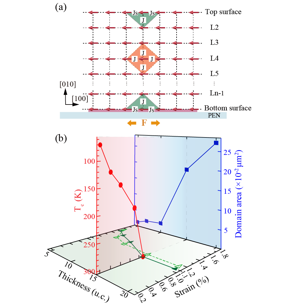 图2| a);薄膜中的偶极-偶极相互作用模型;b) 自支撑SrTiO3薄膜的相图总结,揭示了其铁电性(畴面积和Tc)对膜厚和单轴应变的依赖关系。实线表示实验结果,而绿色虚线表示从横向Ising模型获得的模拟数据