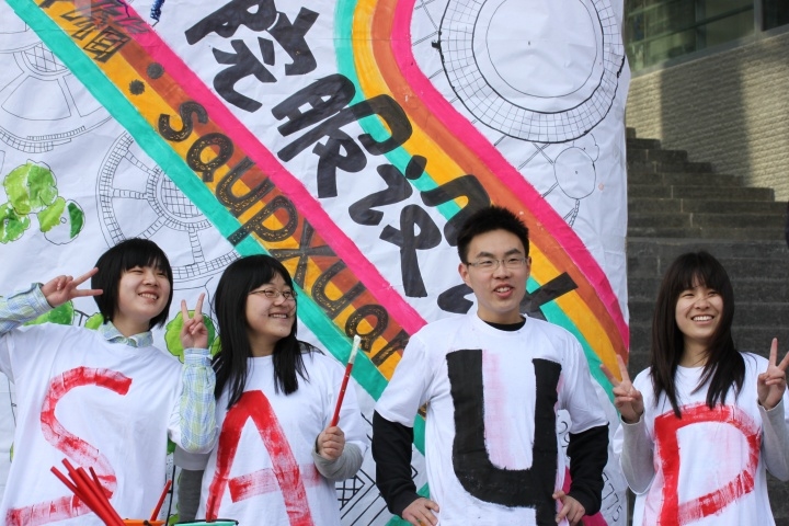 3.22中午,笔者和室友吃完饭后从六食堂走出,一位手拿画笔的同学走上前来向我们说道:“同学,欢迎到我们的手绘海报上进行涂鸦。”还没等我们反应过来她就将一支画笔塞在我手上并令我们走向人群密集处。一群学生手拿画笔在半成品手绘海报上进行涂鸦,脸上还不时露出羞涩的笑容。
