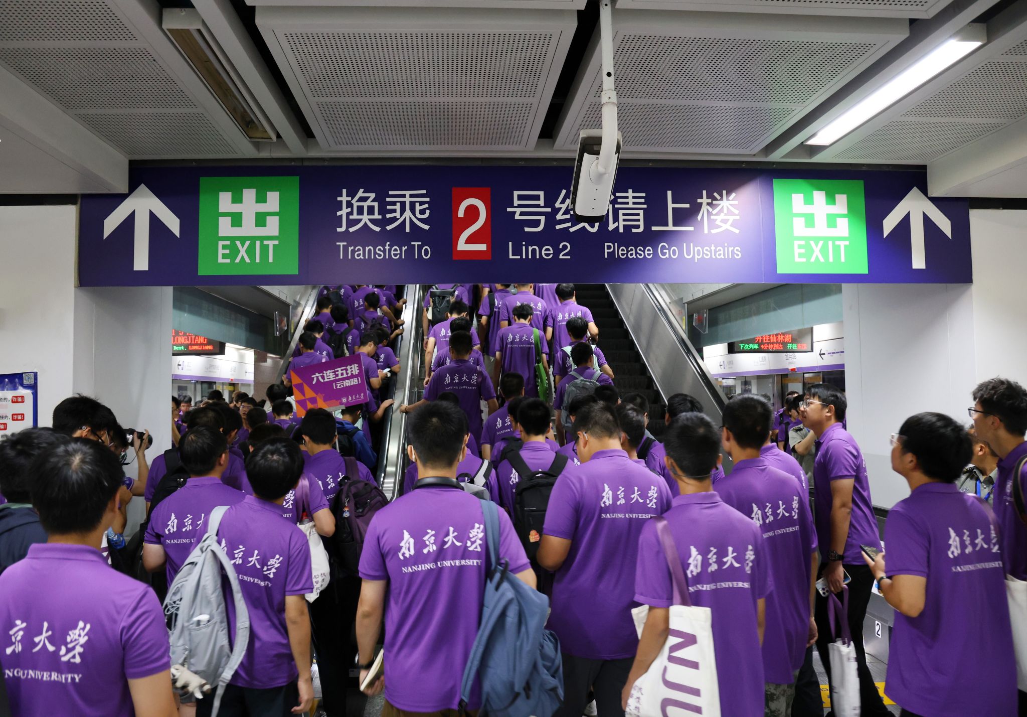 清晨六时许,各方阵整齐列队、英姿飒爽、步履铿锵,分批前往云南路站、鼓楼站搭乘地铁。当身穿凯发紫文化衫的新生,走进紫色装潢的4号线站厅,这是“阿紫”与“阿紫”的相遇——青春气息与城市空间碰撞出别样的火花,带来震撼的视觉冲击。