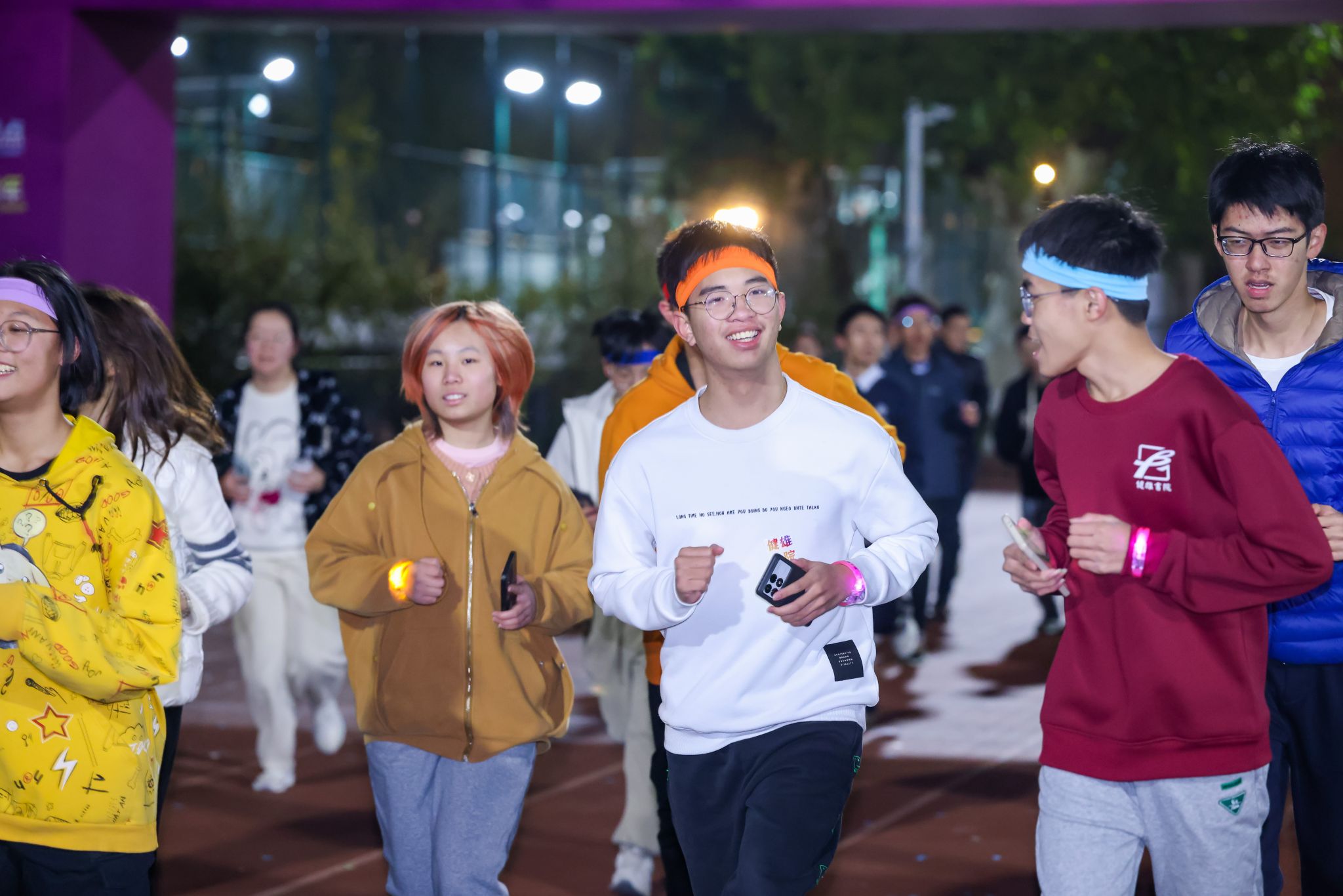 荧光跑启幕之前,健美操中国国家队员、健美操世界冠军刘云松,中国国家乒乓球队前队员、乒乓球世界冠军张缤月率队热身。在两位老师的专业指导下,同学们舒展筋骨,蓄势待发。