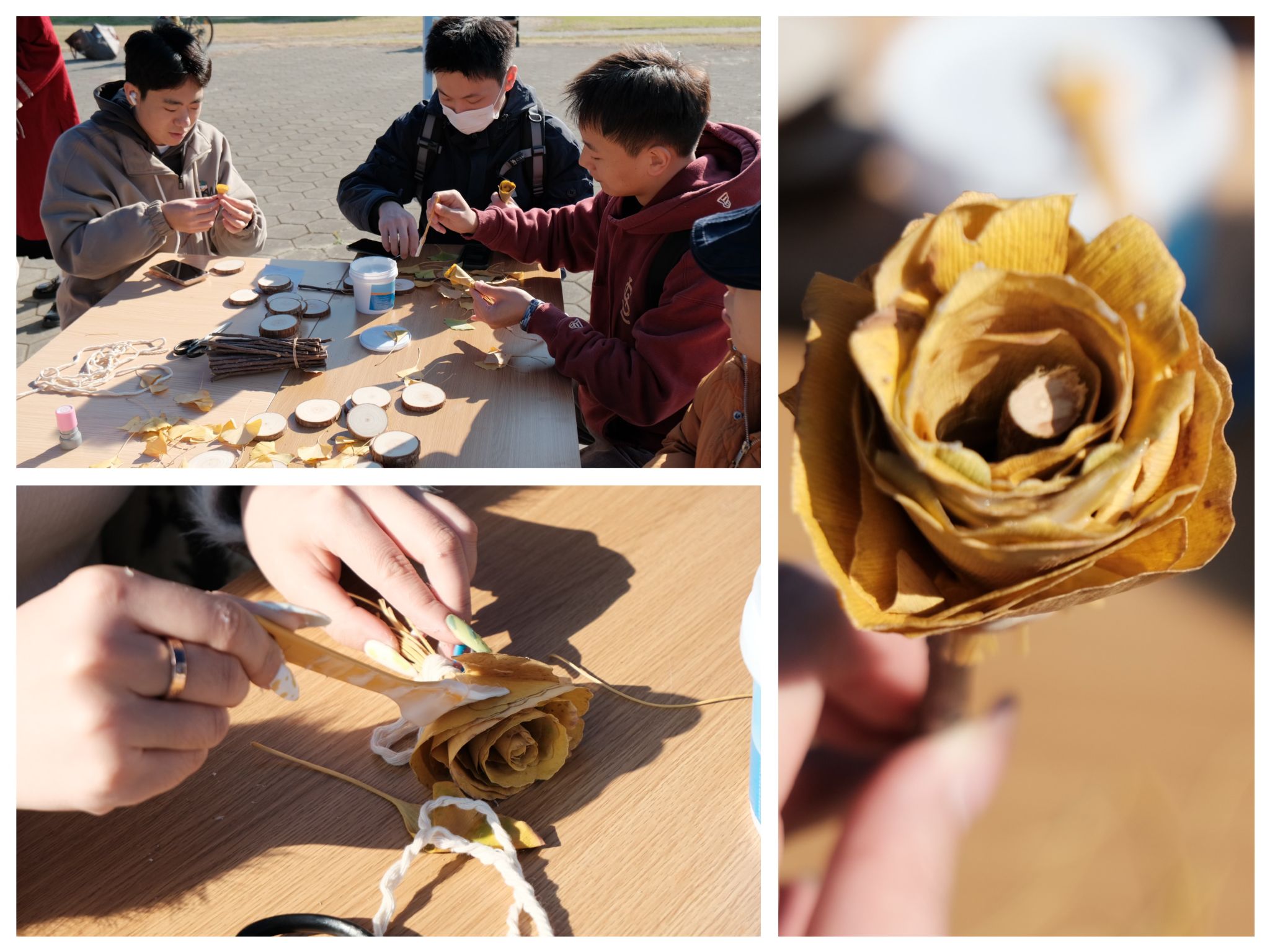 在“银杏圣诞树与玫瑰花制作”展台区,暖阳映衬下的银杏圣诞树与玫瑰花吸引了不少同学的参与。参与者巧妙的将一片片银杏叶围绕着树枝,制作成玫瑰花的造型,每一片叶子经过精心的折叠与排列,呈现出花瓣层叠的细腻质感,银杏的金黄与玫瑰的优雅完美结合。这些“银杏玫瑰”象征着秋冬交替中的生命韵律,也传递出大家对自然的赞美与对艺术创作的热忱,看着用心完成的手作,同学们的脸上都洋溢着满足与喜悦。