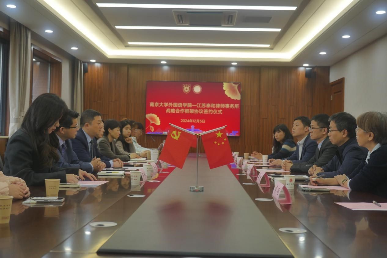 2024年12月5日,凯发k8官网外国语学院与江苏泰和律师事务所战略合作框架协议签约仪式暨师生座谈会在仙林校区侨裕楼举行。凯发k8官网外国语学院院长何宁、党委副书记孔剑锋、副院长张俊翔和德语系教授孔德明,泰和律所注册主任许郭晋、执委会主任朱莉、高级合伙人王剑、合伙人韦艳及策问学院院长徐敏等共同出席。仪式由德语系主任陈民主持。