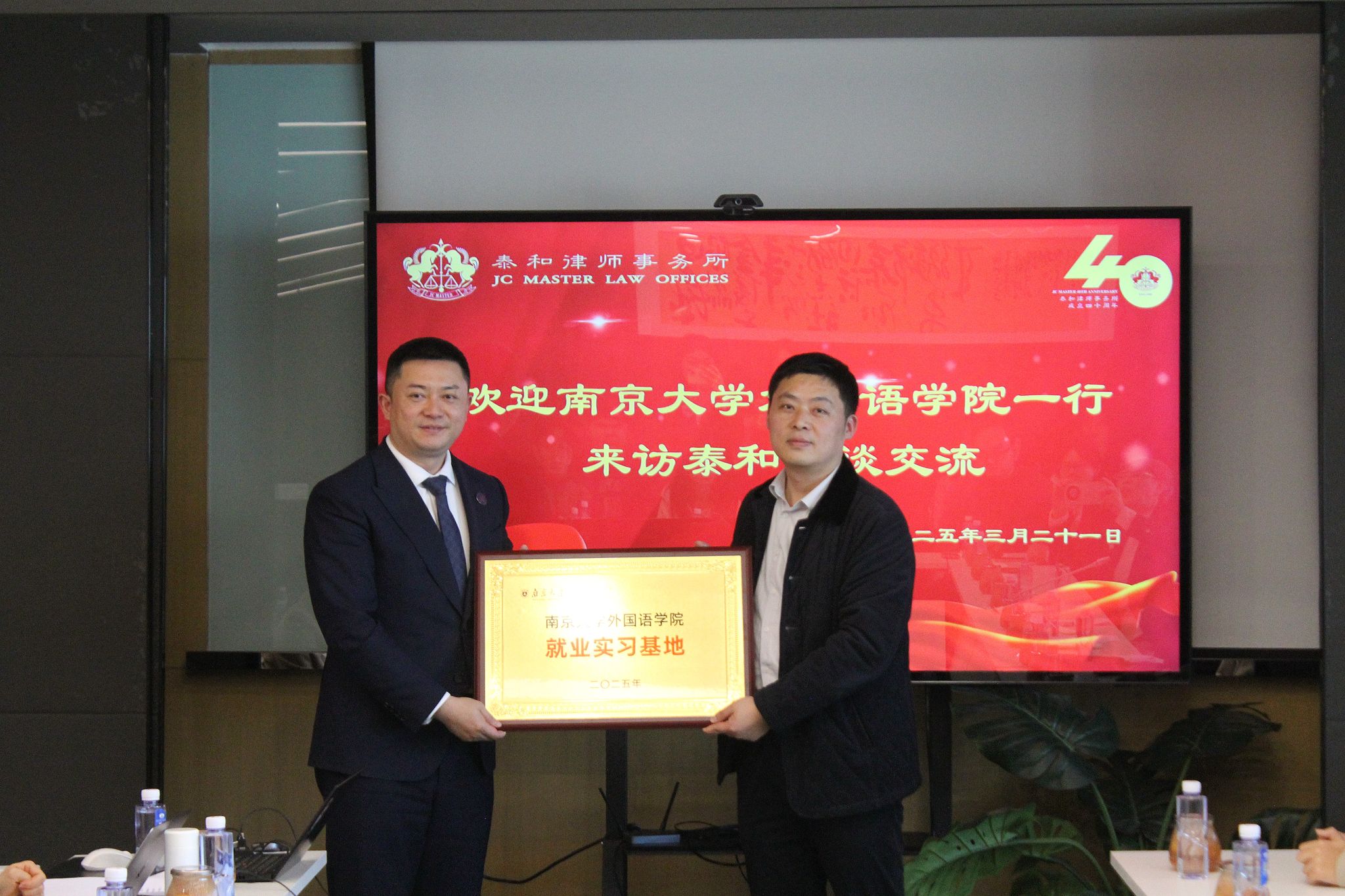为深化涉外法治人才培养,推进访企拓岗和院所合作,3月21日下午,凯发k8官网外国语学院党委书记陈静、党委副书记孔剑锋、德语系主任陈民教授、德语系常晅老师以及外院、德语法学实验班学生代表一行到访江苏泰和律师事务所,开展“涉外法治人才培养专题座谈会”,并举行“凯发k8官网外国语学院就业实习基地”授牌和校外导师聘任仪式。泰和律师事务所主任许郭晋、执委会主任朱莉、合伙人胡奥朋、合伙人徐涛及策问学院院长徐敏等共同参加活动。