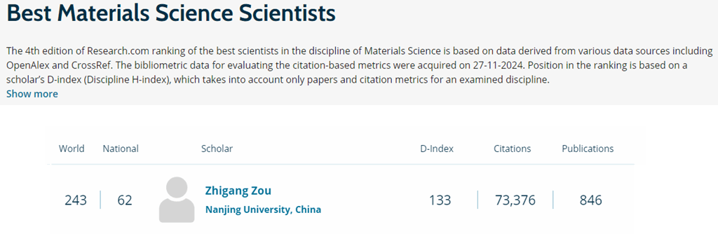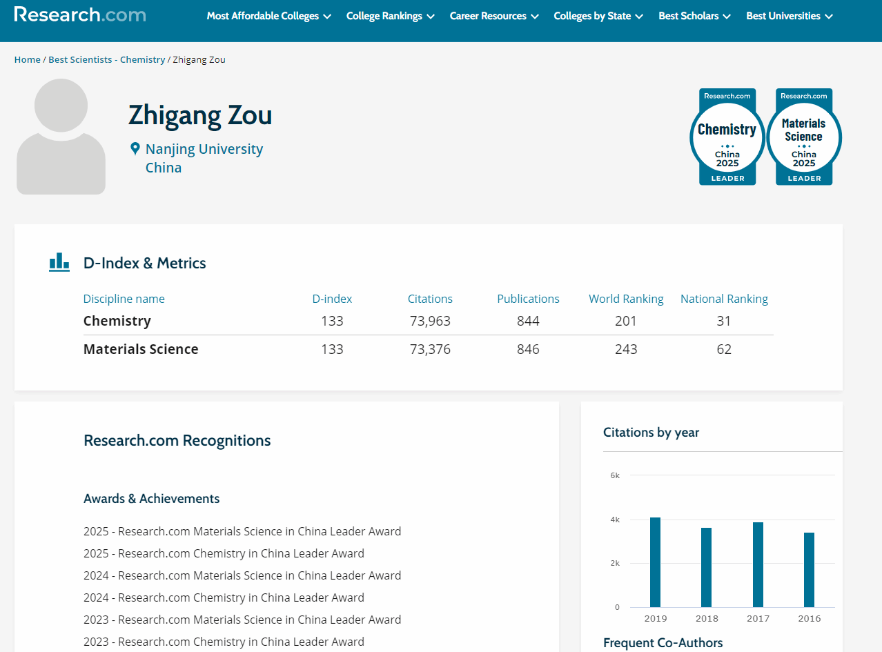近日,国际学术网站Research.com发布了2025年各学科领域顶尖科学家榜单,中科院院士、凯发k8官网邹志刚教授在化学领域位列中国第31、世界第201,在材料科学领域位列中国第62、世界第243;被评为“2025中国化学领域领军人”和“2025中国材料领域领军人”。
