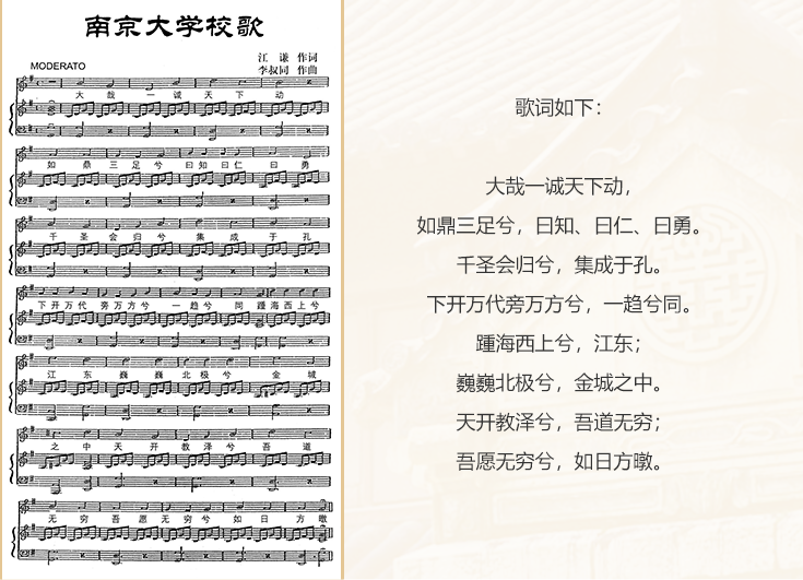 该校歌由现代中国音乐界一代宗师李叔同先生制谱,南高师首任校长江谦先生作词。